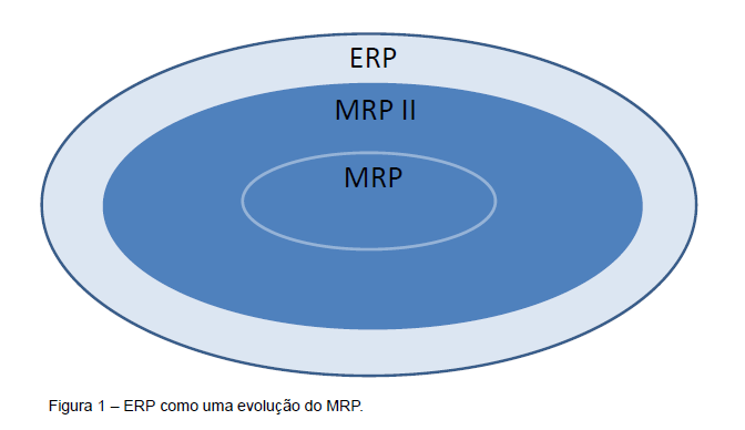 Um ERP é um software de planejamento dos recursos empresariais que integra as diferentes funções da empresa para possibilitar operações mais eficientes. Podem ser entendidos como uma evolução do MRP II, conforme ilustrado na Figura 1, por controlarem tanto os recursos diretamente utilizados na fabricação quanto os demais recursos da organização.