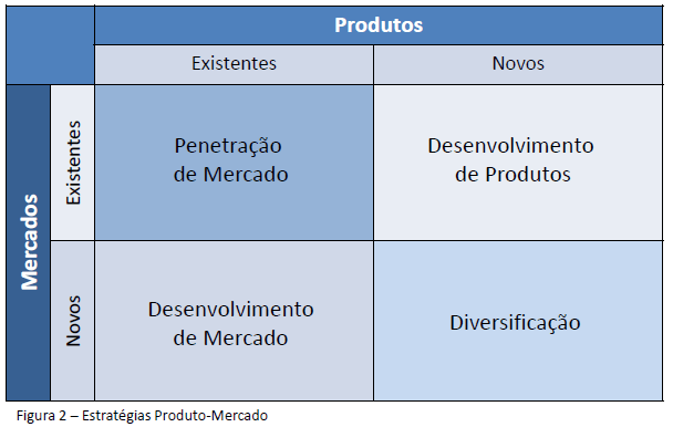 Essa matriz representa as alternativas que Ansoff vislumbrava para aprimorar os negócios de determinada empresa por intermédio de quatro estratégias distintas: penetração de mercado, desenvolvimento de mercado, desenvolvimento de produtos e diversificação.