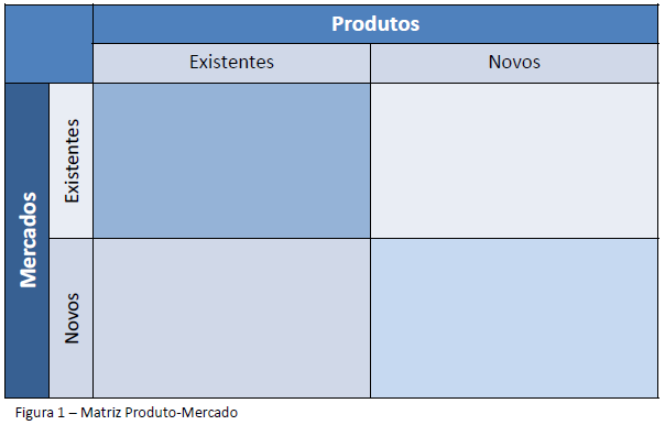 A Matriz tem duas dimensões produtos e mercados e quatro quadrantes conforme a Figura 1.