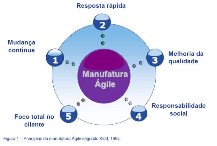 O projeto da manufatura ágil deve ser elaborado, portanto, tendo‐se em mente cinco vetores segundo Kidd: 1) mudança contínua; 2) resposta rápida; 3) melhoria da qualidade; 4) responsabilidade social; 5) foco total no cliente.