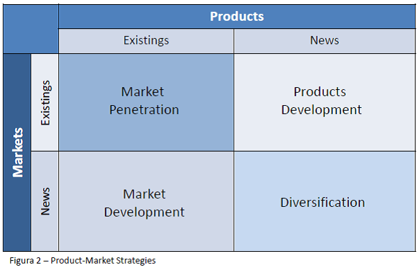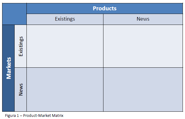 The matrix has two product dimensions, two market dimensions, and four quadrants, as shown in Figure 1.
