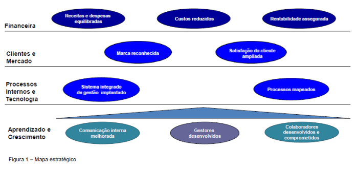 Na Figura 1 utilizou-se: financeira, clientes e mercado, processos internos e tecnologia e aprendizado e crescimento.