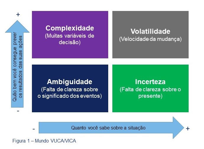 A Figura 1 ilustra as dimensões do Mundo VUCA/VICA numa matriz de 4 (quatro) quadrantes em que eixo X representa o seu nível de conhecimento sobre a situação atual, maior ou menor e o eixo Y quão bem você consegue prever/antecipar os impactos das suas ações, melhor o pior.