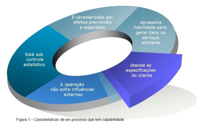 Um processo que tem capabilidade é um processo que tem capacidade. Em outras palavras quando ele, além de estar sob controle, atende aos requisitos do cliente. Pode-se ter processos sob controle, mas que são incapazes. Por exemplo se em uma agência bancária ou posto de saúde o tempo médio de atendimento ao cliente/paciente foi especificado em 25 minutos com 5 de tolerância e esse tempo é cumprido pelo banco ou posto de saúde, mas o cliente espera ser atendido em até 15 minutos, o processo estaria sob controle, mas ainda assim seria considerado incapaz, pois não atenderia à especificação do cliente/paciente.