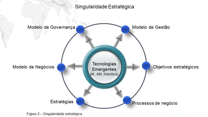 A singularidade estratégica seria a capacidade das empresas de integrar as tecnologias emergentes com as pessoas com o intuito de gerar inovação disruptiva nos seus modelos de governança, de gestão, de negócios, nos seus objetivos, nas suas estratégias e consequentemente nos seus processos de negócio.