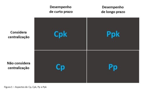 Na Figura 1 pode-se observar um resumo das principais informações que o Cp, Cpk, Pp e Ppk nos transmitem (desempenho de curto e longo prazo) e se contemplam ou não a centralização do processo.