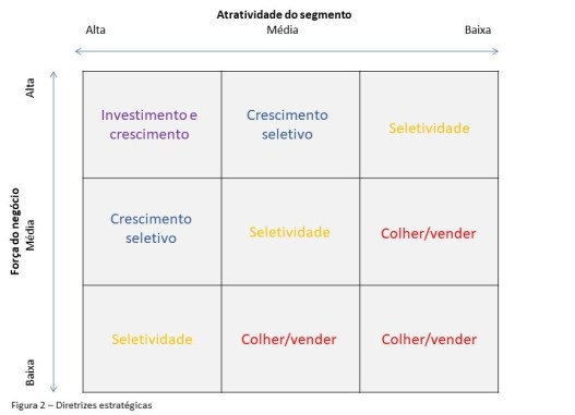 A matriz com as diretrizes estratégicas apresenta um quadrante que recomenda investimento e crescimento, dois que recomendam crescimento seletivo, três que recomendam seletividade e três que recomendam colher ou vender.