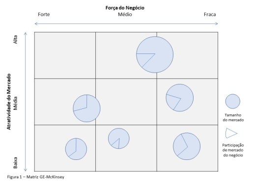 Os negócios são posicionados segundo a atratividade do mercado no longo prazo no eixo y em termos dela ser alta, média ou baixa e a força competitiva da unidade de negócios naquele mercado no eixo x considerando se ela é forte, média ou fraca como mostrado na Figura 1.