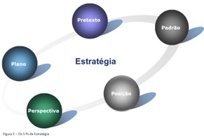 Com o intuito de nos auxiliar a compreender o conceito de estratégia em toda a sua abrangência, Henry Mintzberg publicou originalmente no California Management Review em 1987 um artigo com o título Five Ps for Strategy onde ele apresenta a estratégia a partir de cinco visões: plano, pretexto, padrão, posição e perspectiva ilustradas na Figura 1.