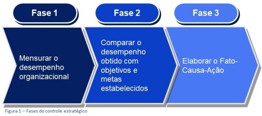 O controle estratégico se desenvolve em três principais etapas: mensurar o desempenho organizacional, comparar o desempenho obtido com objetivos e metas estabelecidos e elaborar o fato-causa-ação conforme ilustrado na Figura 1.