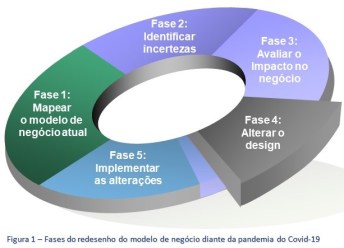 A propósito o Gartner em um estudo denominado Create a Resiliente Business Model in the Face of Covid-19, desenvolvido por Kasey Panetta e publicado recentemente, recomenda uma abordagem em cinco fases para assegurar a resiliência do modelo de negócio diante das ameaças representadas pela Covid-19. As cinco fases, ilustradas na Figura 1 são: mapear o modelo de negócio atual, identificar incertezas, avaliar o impacto no negócio, alterar o design e implementar as alterações.