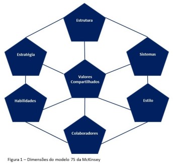 Nele Peters e Waterman identificam sete dimensões de uma empresa que precisam estar alinhadas para que ela obtenha sucesso. Essas dimensões são: strategy, structure, systems, skills, staff, style e shared values ou estratégia, estrutura, sistemas, habilidades, colaboradores, estilo e valores compartilhados ilustradas na Figura 1.