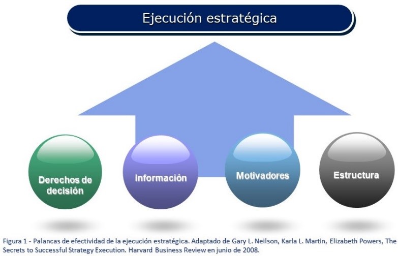 En este estudio, compilado en The Secrets to Successful Strategy Execution publicado en Harvard Business Review en junio de 2008, los autores identificaron cuatro palancas clave que los ejecutivos deben considerar para garantizar una buena ejecución estratégica: derechos de decisión, información, motivadores y estructura ilustrada en la Figura 1 .