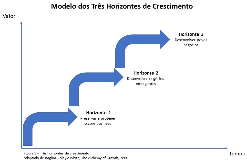 No livro The Alchemy of Growth, publicado em 1999, Mehrdad Baghai, Stephen Coley e David White, apresentam um olhar sobre a agilidade estratégica a partir do Modelo dos Três Horizontes. Na publicação os autores descrevem as abordagens que, segundo eles, conseguiram ajudar seus clientes corporativos em todo o mundo a acelerar o ritmo. As empresas devem focar simultaneamente em “três horizontes” críticos para o crescimento. O primeiro é o atual negócio da empresa, core business; o segundo, os negócios emergentes, promissores e de rápido desenvolvimento; e o terceiro, as ideias que irão assegurar os resultados futuros, ou seja, novos negócios.