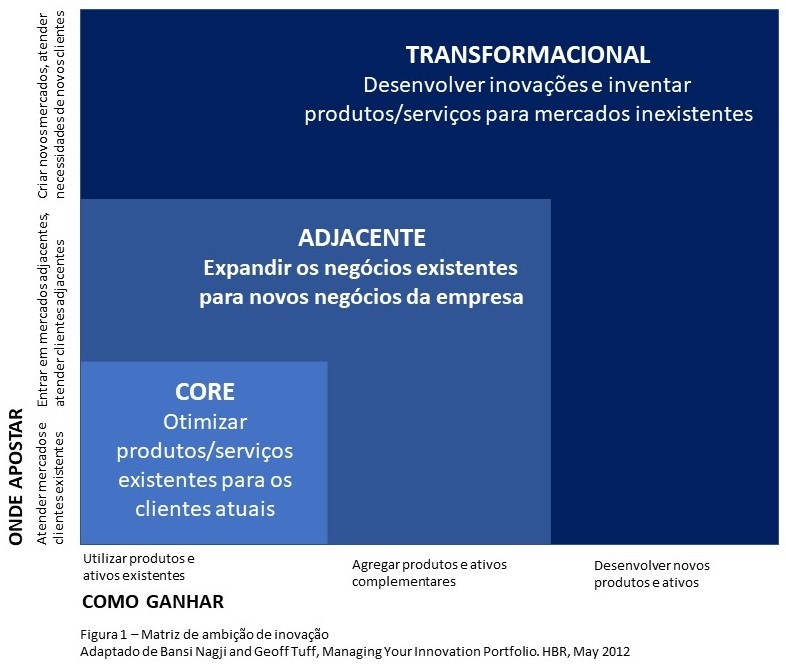 A Matriz identifica três níveis de inovação que vão do incremental, core, até o disruptivo, transformacional, passando pela expansão nas adjacências conforme ilustrado na Figura 1.