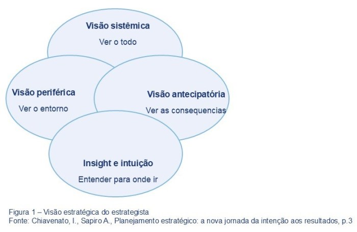 Segundo Chiavenato e Sapiro (2023), a visão estratégica pode ser desdobrada em quatro perspectivas, quatro maneiras de compreender o mundo conforme ilustrado na Figura 1: visão sistêmica, visão periférica, visão antecipatória, insight e intuição.